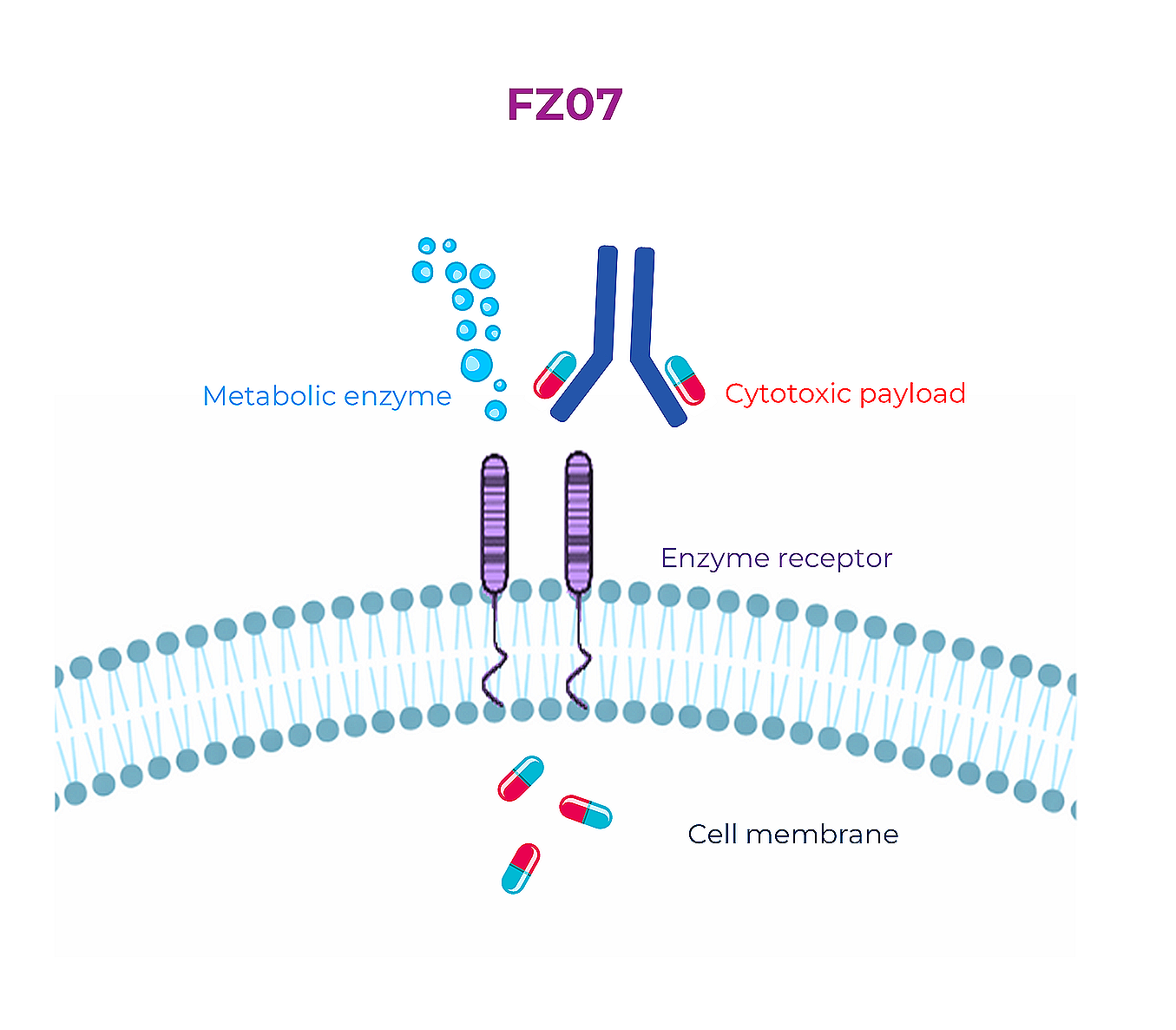 FZ07 ADC is a receptor-specific antibody coupled with a cytotoxic payload. The antibody binds to the receptor expressed on the surface of dormant cancer cells. The receptor undergoes endocytosis and delivers the ADC to the lysosome where the payload is released.